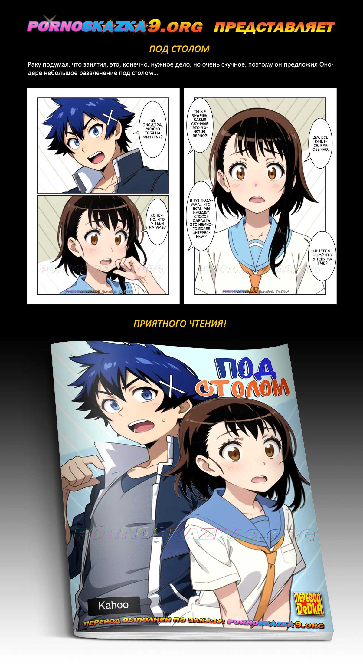 Раку подумал, что занятия, это, конечно, нужное дело, но очень скучное, поэтому он предложил Онодере небольшое развлечение под столом…